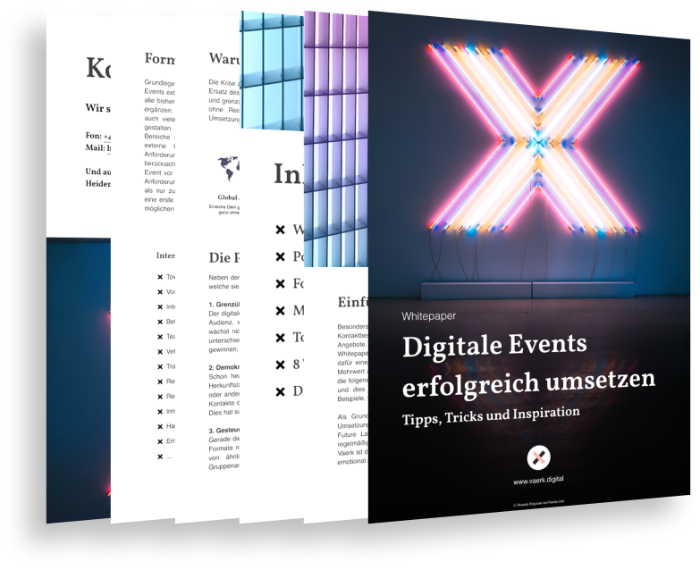 Wir haben in den vergangenen Monaten viele digitale Events miterlebt und all unsere Erfahrungen im Whitepaper zusammengefasst. Es dient als Einführung in die Organisation und Umsetzung von Online-Events, gibt einen Überblick zu möglichen Anwendungsfällen und zeigt die Potenziale von digitalen Formaten auf.
